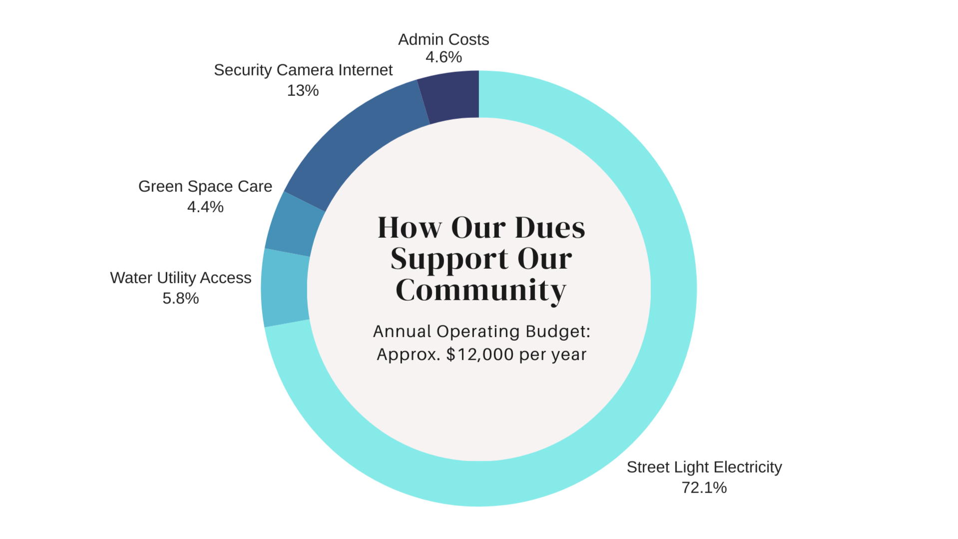 Community street lighting (approx. $650/month) to have a well-lit neighborhood. Studies have shown that well-lit neighborhoods can reduce crime risk by 21%, nighttime traffic accidents by 30%, and enhance the residential feeling of safety.Utilities access to water (approx. $52/month) and care for our green spaces (approx. $500/year) in order to preserve our landscaping. Having well kept green spaces has been shown to increase nearby property values upwards of 20%.Security camera internet (approx. $120/month), which aids us in identifying problems that may arise. Studies show that monitored communities can lower their crime risk up to 50% compared to unmonitored communities.Basic administrative needs (approx. $500/year), which ensures our HOA can provide access to services that enhance our community's wellbeing, communication, and collective influence. This includes our PO Box ($250/year), website maintenance, and communication materials.Our goal as your HOA Executive Council is to ensure you remain informed about how community funds are stewarded and have an easy experience contributing to our community's wellbeing. If you have questions or suggestions, we welcome your feedback! Please share it with us here, and we will be in touch.- Your HOA Neighbors
